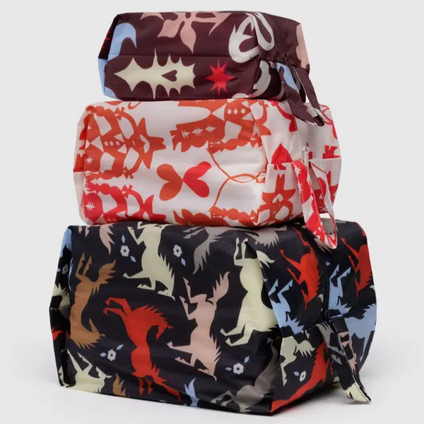 A set of three zippered pouches for travel and organization, with loops for carrying and hanging on the go. Perfect for packing, organizing your bag, or home tidying.
