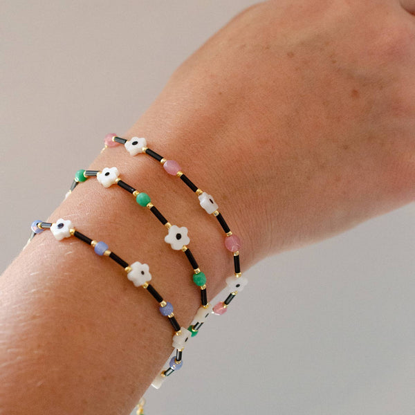 This handmade bracelet features handpainted shell flowers, Czech glass beads, and seed beads. Available in pink, green, and periwinkle. This listing is for one bracelet. Length: 7 inches with 1-inch adjustable chain.