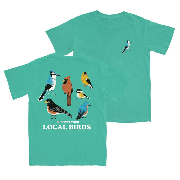 Support your local birds! Get excited about the wildlife in your backyard with our super comfy tee featuring six common species.