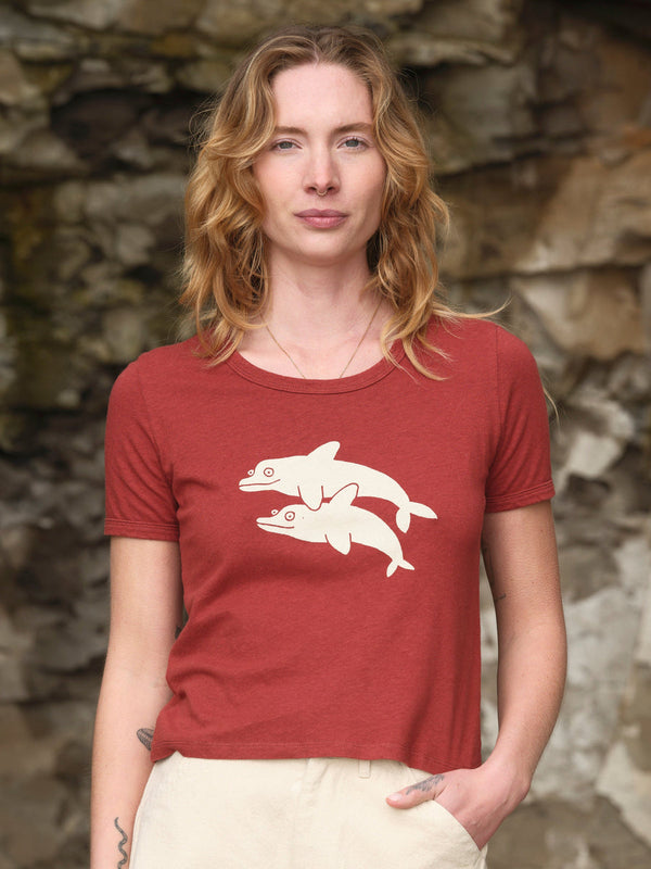 People love dolphins for many reasons, including their intelligence, playfulness, and ability to communicate with humans. Artwork by Nat Russell. Karli is 5' 9" tall and wearing size XS.