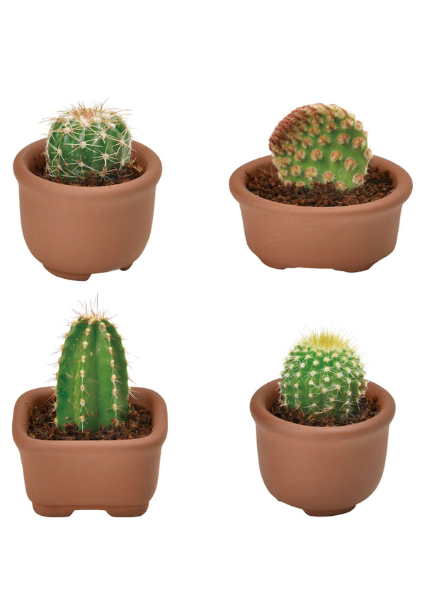 Created sixty years ago, capsule toys (Gashapon ガシャポン) are plastic pods containing a small surprising, clever or collectible object. Due to their popularity capsule machines are now ubiquitous in urban Japan. Green Capsule Cacti Cuties capture the fun and surprise of Gashapon for plant lovers. Inside each Green Capsule is a rustic styled clay pot, growing pellet, and seeds for growing one of four famous cacti. The petit pot is perfect for starting the slow growing cacti and can serve as a home for a baby cacti for its first year.