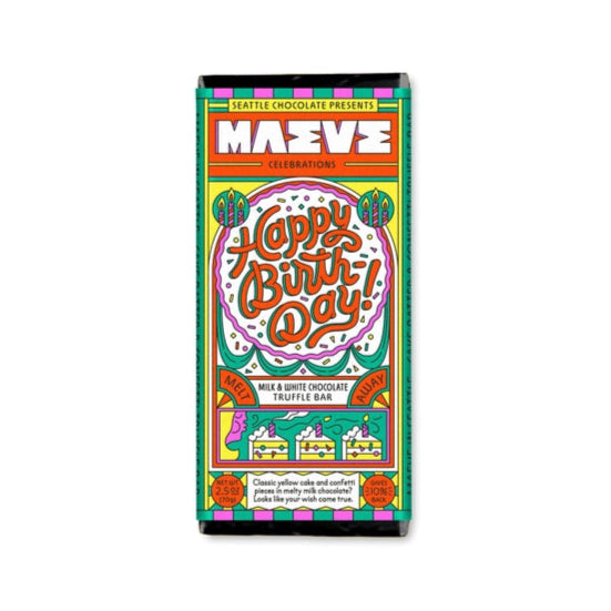 Colorful birthday cake truffle center with confetti pieces in milk chocolate. Tastes like birthday wishes with flavors of yellow cake, and vanilla frosting with confetti candy.