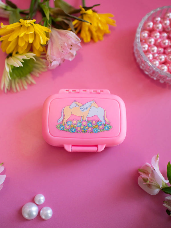 Calling all horse girls! Carry your meds and vitamins in style with this pink pill case that has two convenient, removable dividers on the inside that creates 3 separate compartments . Shaped like an adorable mini suitcase. Water proof + smell proof! Measures 3.25" x 2.5" x 1"