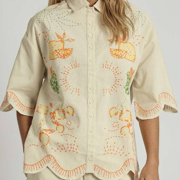 A summer essential with all the details, the Native Youth Beach Print Shirt is crafted from breathable, textured linen for effortless warm-weather dressing. Featuring a vibrant beach-inspired print, delicate embroidery, and scallop-edge detailing, this shirt has everything you need for a standout look. The relaxed fit makes it perfect for layering over swimwear or pairing with matching co-ords for a chic, laid-back vibe.