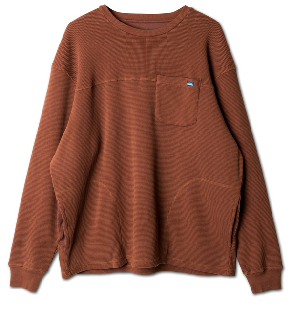 Heavy 16oz waffle knit work-wear inspired pullover. We can't get enough of the rib knit neck and cuffs and the stitch outlined front and back yokes and seam hand pocket bags. Just enough flair to peacock around and make your own cousin jealous.