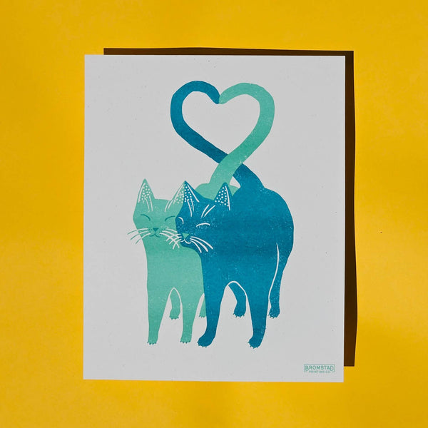 Two felines smitten, their tails entwined in a heart-shaped embrace. Risograph printed in seafoam and teal.
