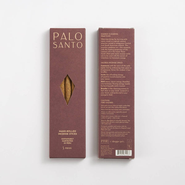 • Palo santo incense sticks offer inherent soothing and cleansing properties found in the resinous oil of the wood.