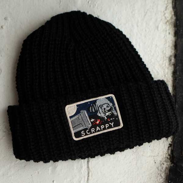 Our chunky knit beanies are sumptuously squishy, universally flattering and perfect for brisk Canadian winters (and beyond)! These are made from scratch right here in Montreal and we sew the patches on in-house. This style comes in black with our "Scrappy" raccoon embroidered patch securely stitched onto the rolled edge.