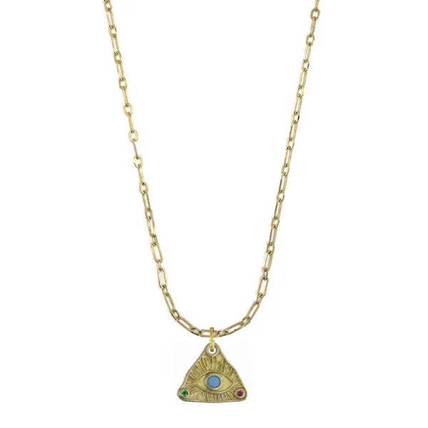 A statement necklace with a unique cast brass pendent featuring an eye design and vibrant cubic zirconia rhinestones that'll make your outfit pop!