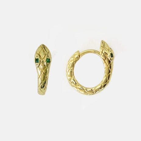 Unleash your inner goddess with these ssssensational Snake Goddess Huggies! Crafted with 18k gold and green cubic zirconia eyes, these slithery huggie hoops will have you feeling snake-charmed! Measuring .75 inches tall including the extended head, and 14 mm hoop, these cuties are sure to bring some out-of-the-box style to your look. (Plus, no nickel here!)