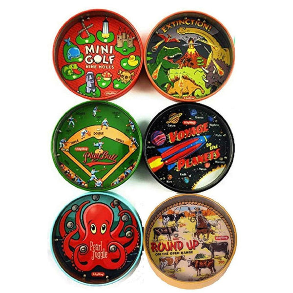 Are you up to the challenge? These Tin Ball Mazes are as fun as they look, but not as easy as they seem! A colorful tin base lies under metal ball bearings that creates a sturdy feel for at-home or portable play. Each base has a captivating printed design, playing tricks on your eyes and taking this tin maze to a whole new level!