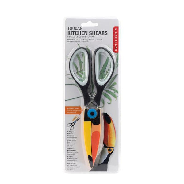 Take a bite out of meat, fruits, and veggies with the Toucan Kitchen Shears. Features a magnetic cover for easy, convenient storage.