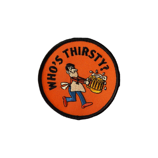 Bring a splash of fun to your wardrobe with our "Who's Thirsty?" iron-on embroidered patch Perfect for anyone who knows the best stories start with a drink in hand.