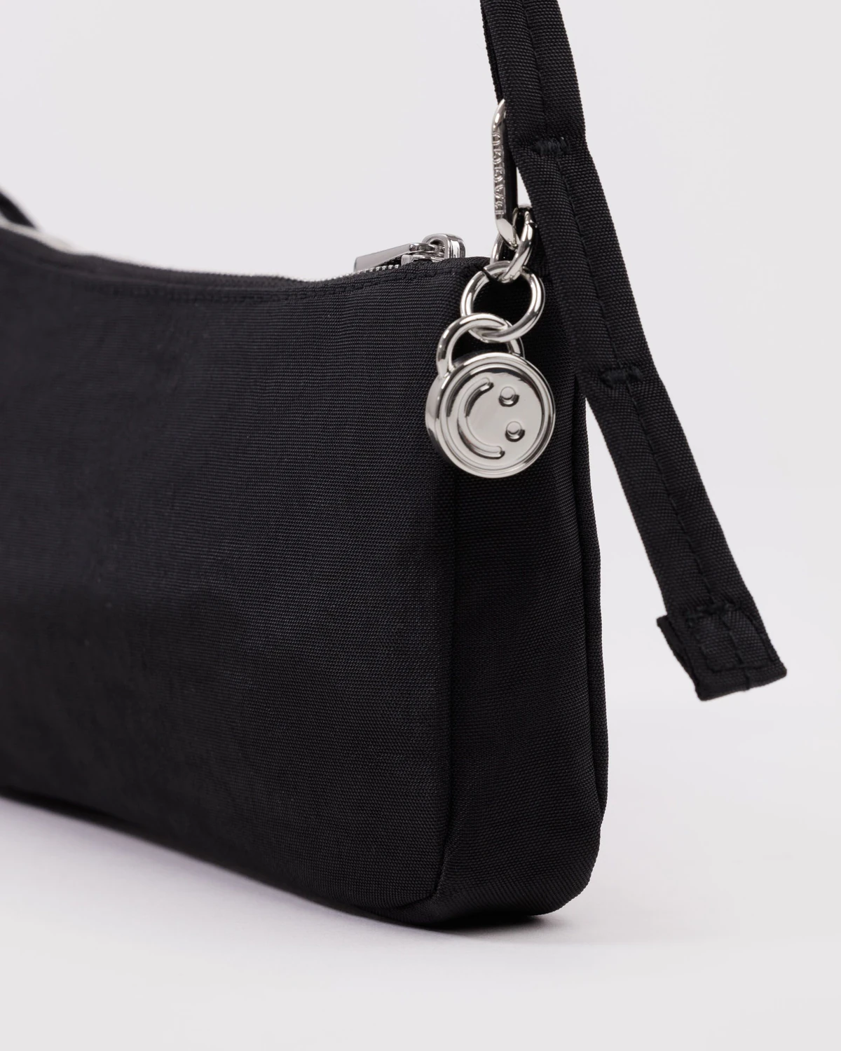 ● All metal hardware including charm clip and detachable smiley face charm.