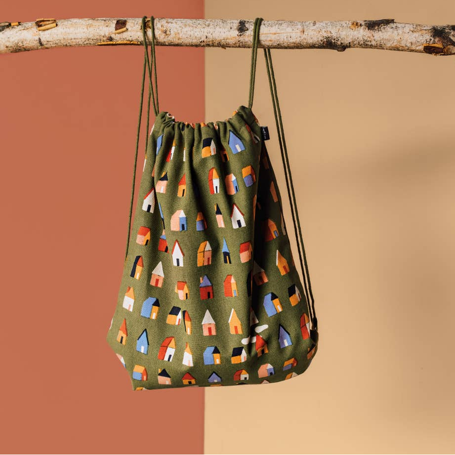This Burrow Cinch Backpack features charming tiny houses printed on olive green. It's cute, practical, and sure to spark smiles wherever you go.