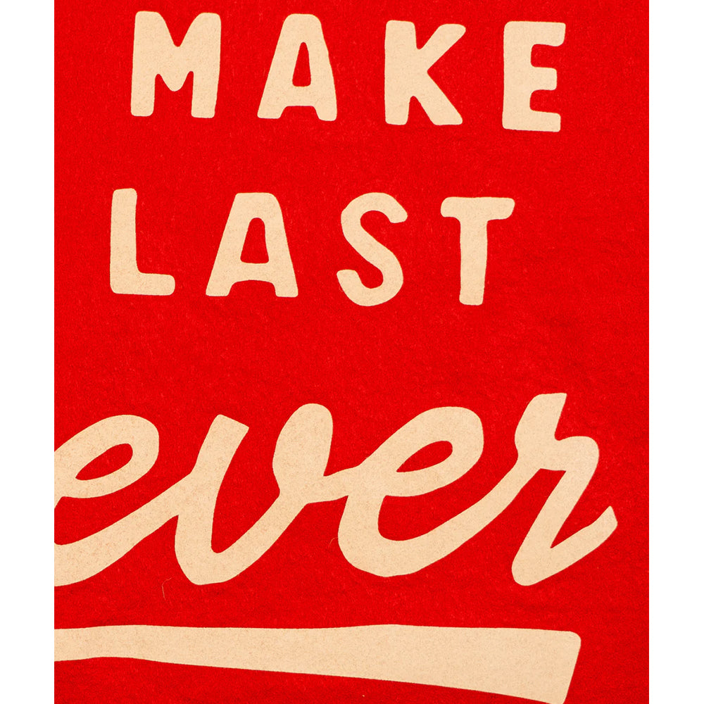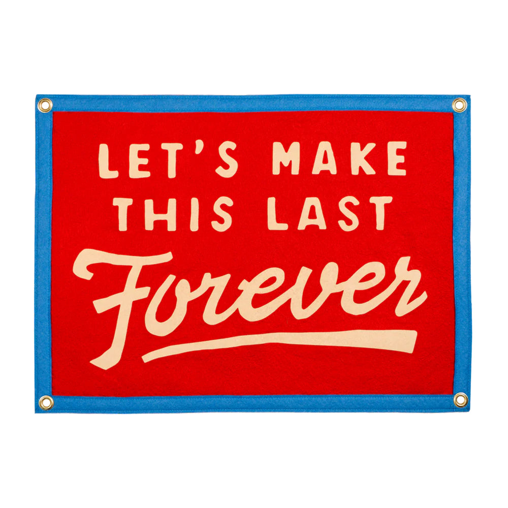 Big feelings, bold colors, and a lyric that defined an eighth-grade soulmate. This red and blue camp flag is for anyone who still believes in forever—or at least until the next track. Hang it above a bed and prepare to catch feelings.