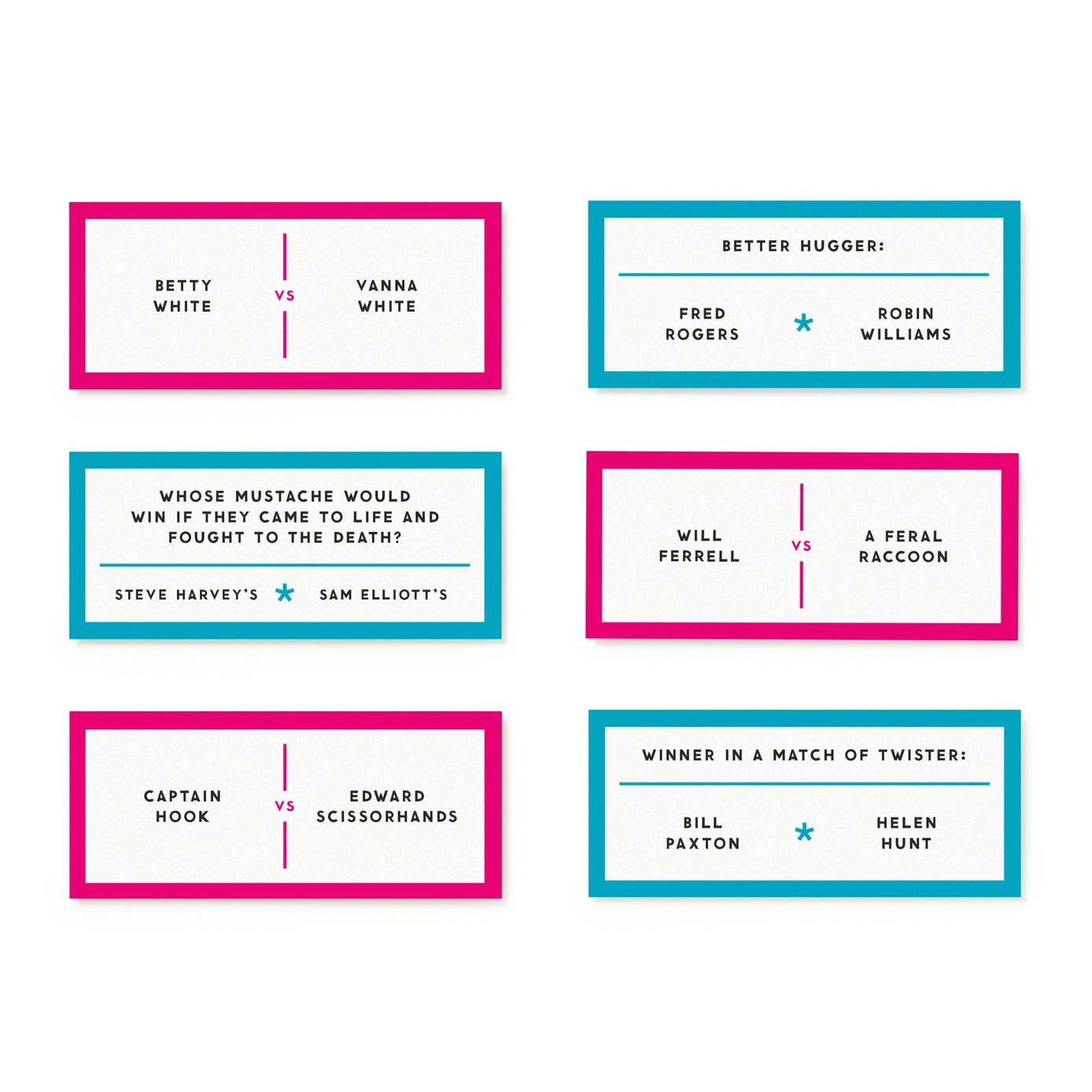 Win points for winning arguments. Inside, you’ll find hundreds of hilariously-hypothetical battles–like whose mustache would win in a fight to the death, Steve Harvey's or Sam Elliott's.