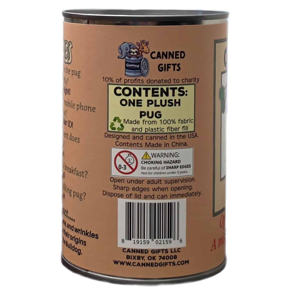 - plush pug dog sealed in a can