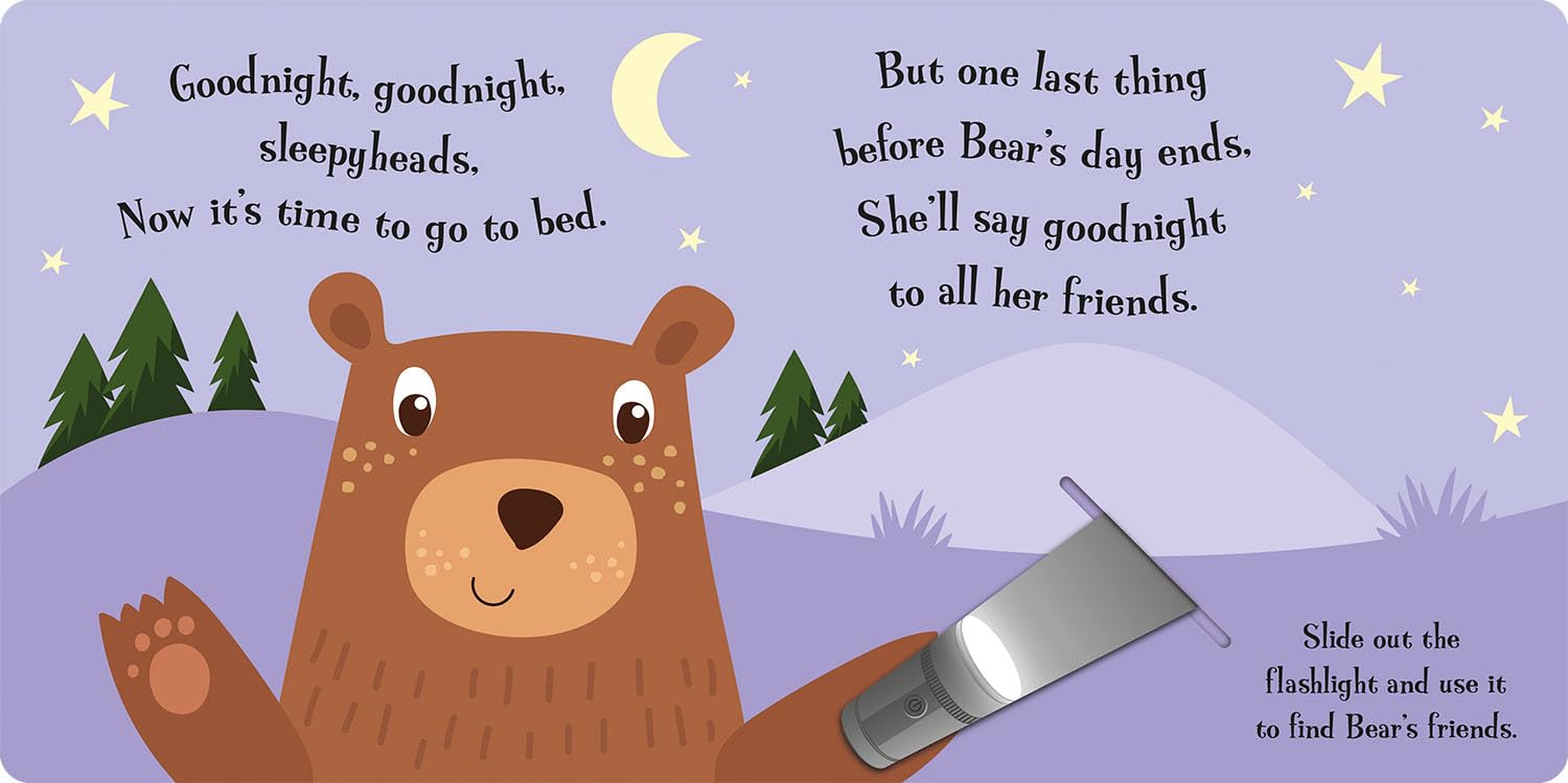 Bear is ready for bed, but first she wants to say good night to all her animal friends.