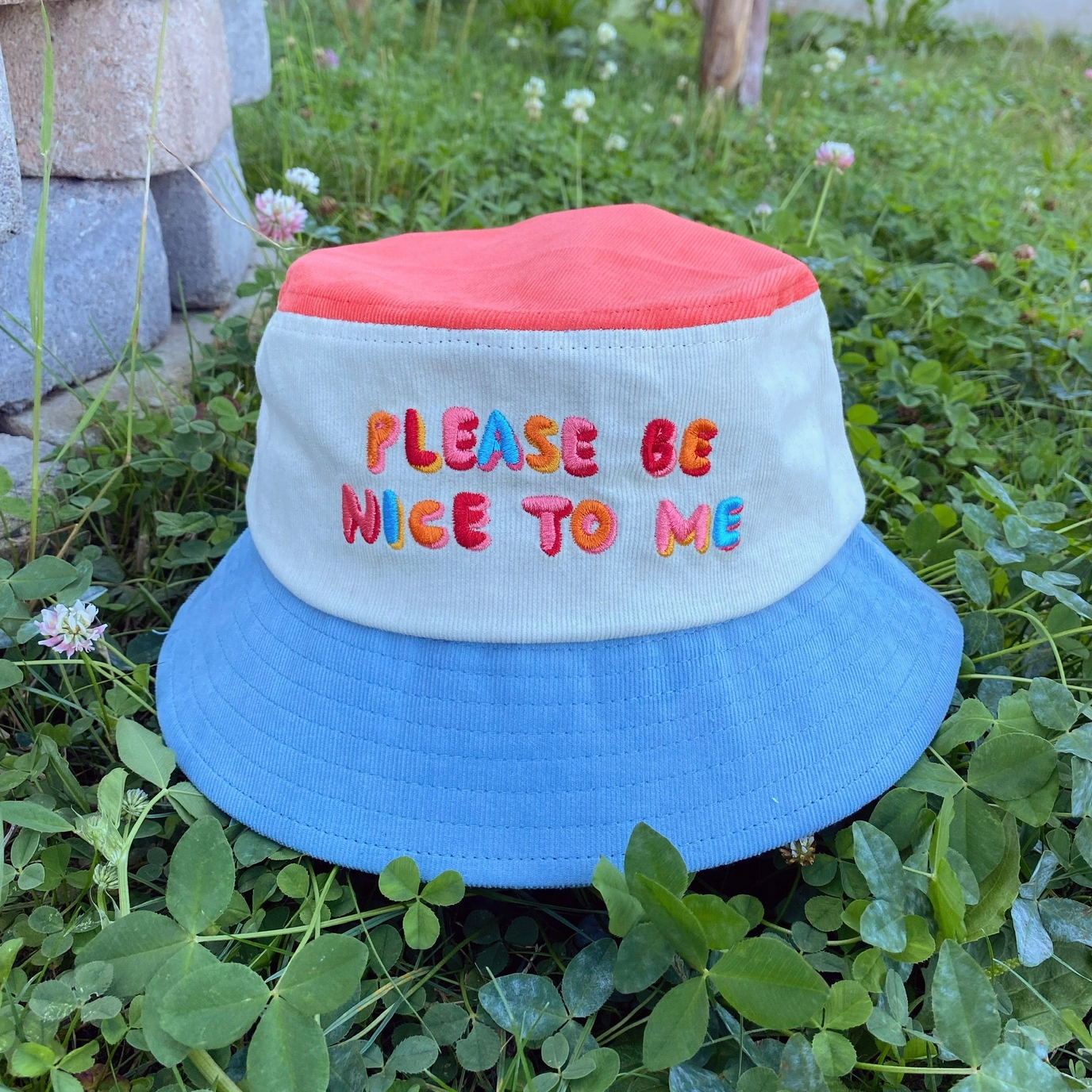 Hats are a fine corduroy in orange, cream, and blue with embroidery on the front. Inside measurements of just under 24 inches.
