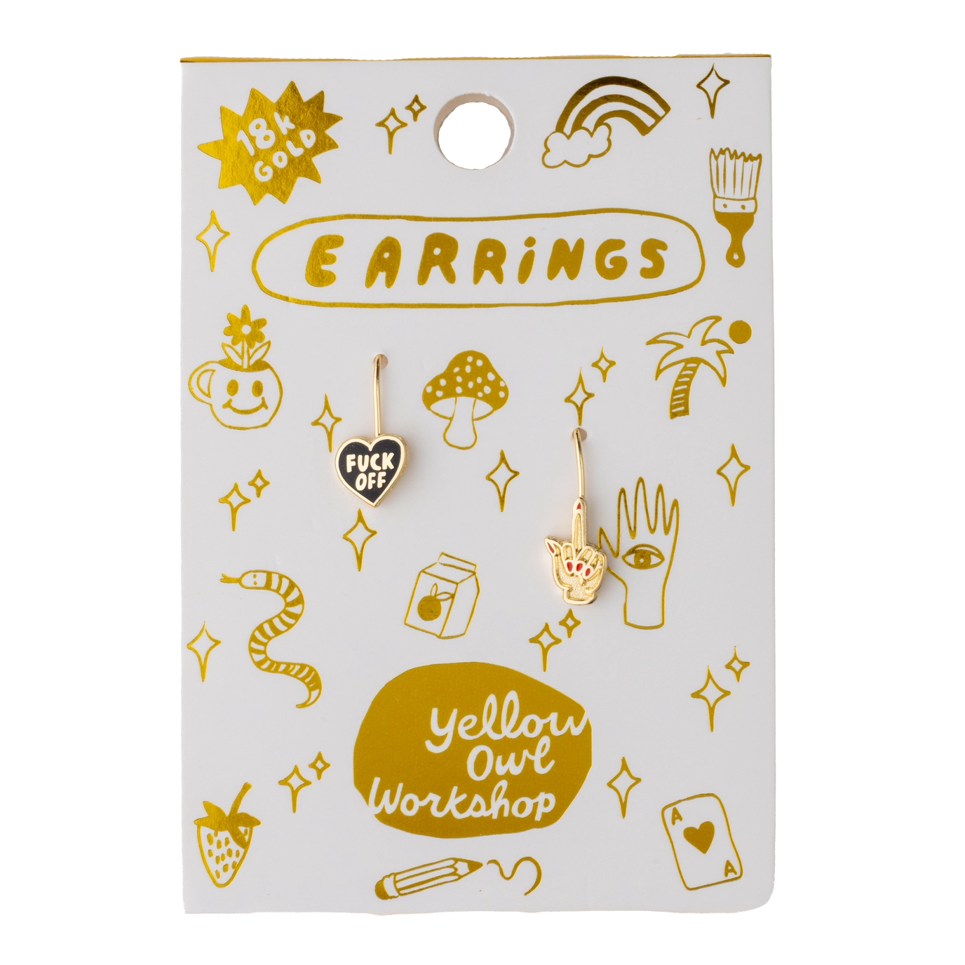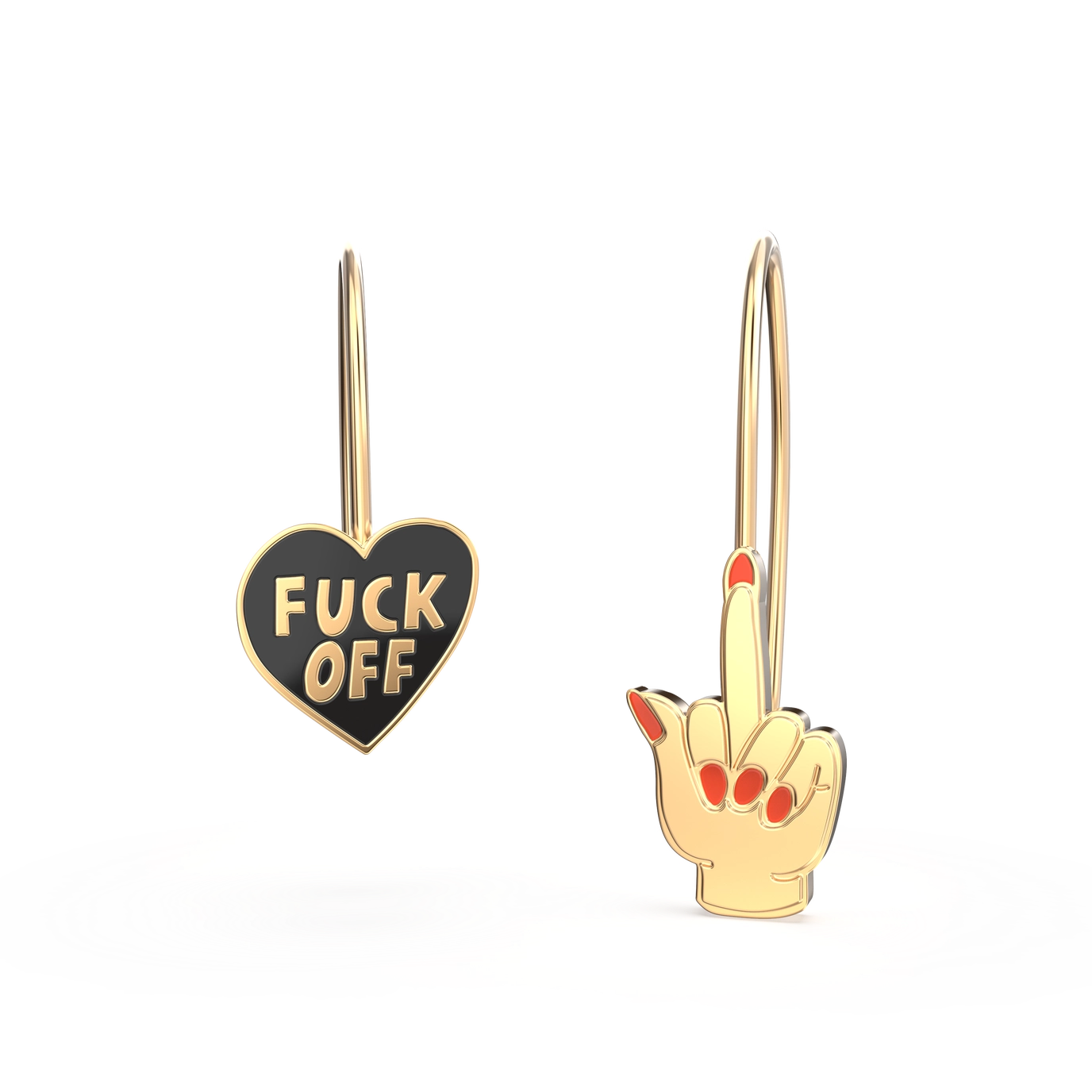 Adding to our collection of bold, swear-word laced jewelry and accessories, these earrings have a crystal clear “F*ck Off” message with heart-shaped and middle finger charms. Wear one on each ear, or combine them in a double ear piercing!