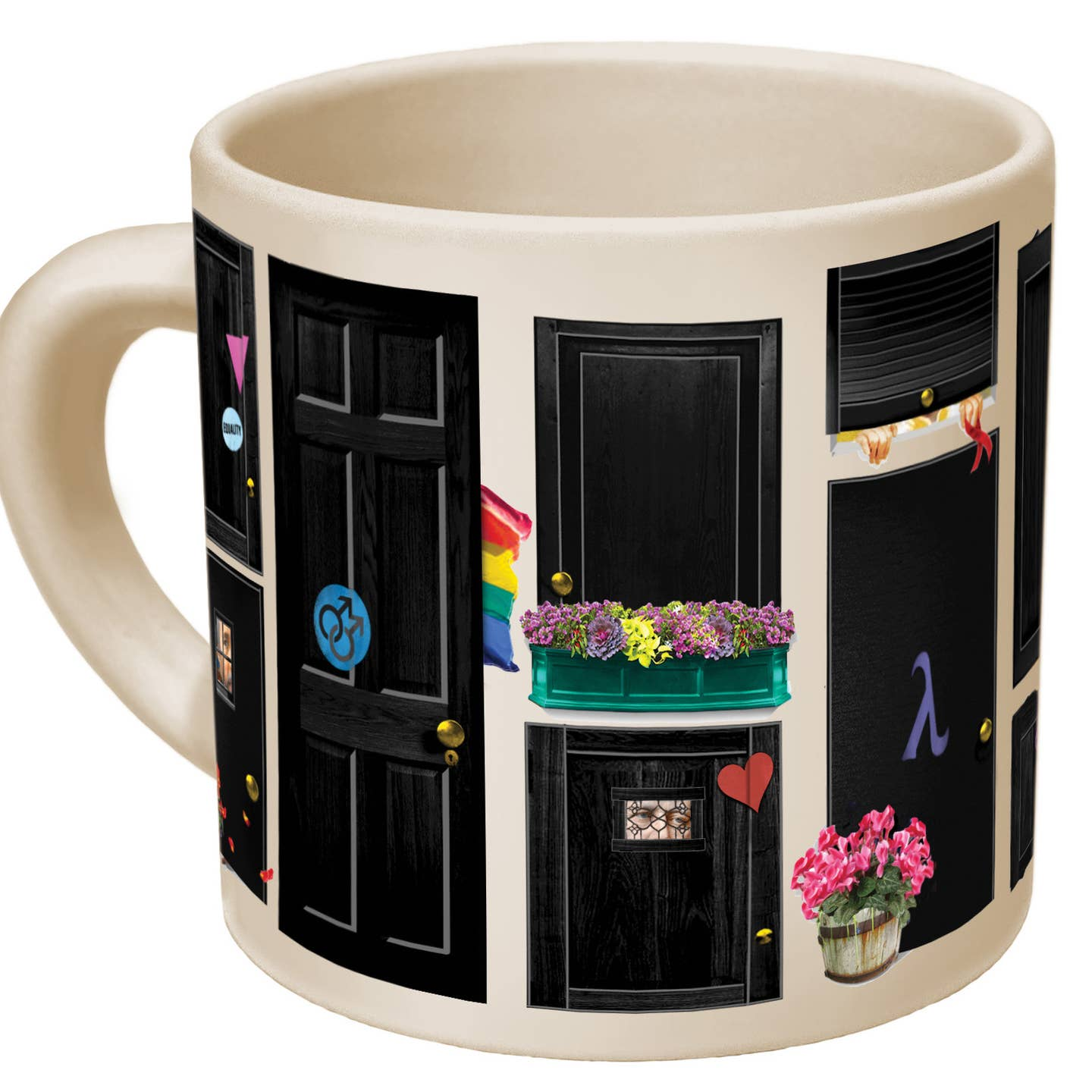 When the mug is empty, it shows fourteen closet doors. But when you pour in a hot beverage, 14 of the world's most famous gays proudly emerge.