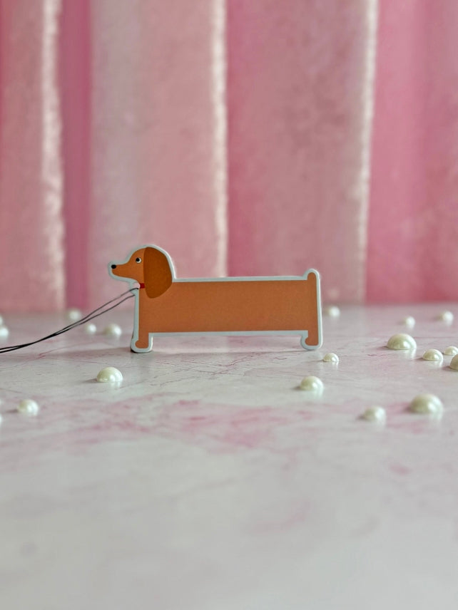 This air freshener is shaped just like a dachshund! If you want your car to smell good, we're paw-sitive this good boy will do the trick! Vanilla scented and comes with an elastic cord to loop around a rearview mirror.