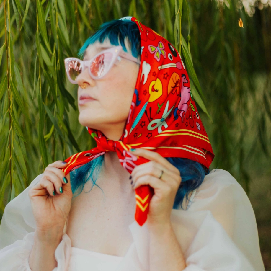 The junk drawer just got CHIC! This allover print silk scarf features tons of treasures like doll shoes, bows, matches, buttons, bobbie pins, and soooo much more.