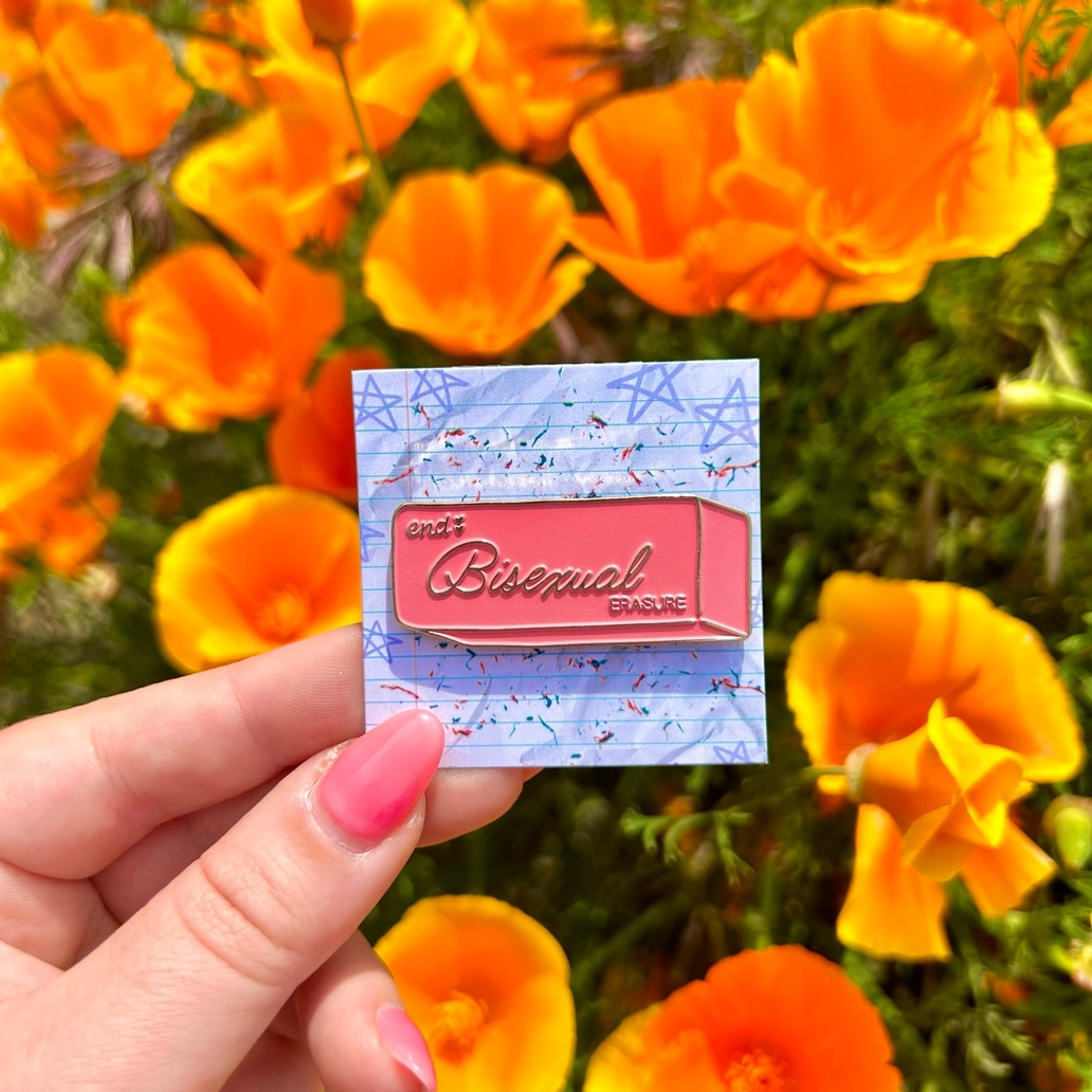 This pin is not your average eraser; it's a stylish and vibrant symbol of visibility and inclusivity. Shaped like a classic eraser, it boldly declares "end bisexual erasure" with a wink and a nod. Attach it to your bag, jacket, or hat and show the world that bisexual voices and identities matter. Let's erase the erasure and celebrate the beautiful spectrum of love and attraction.