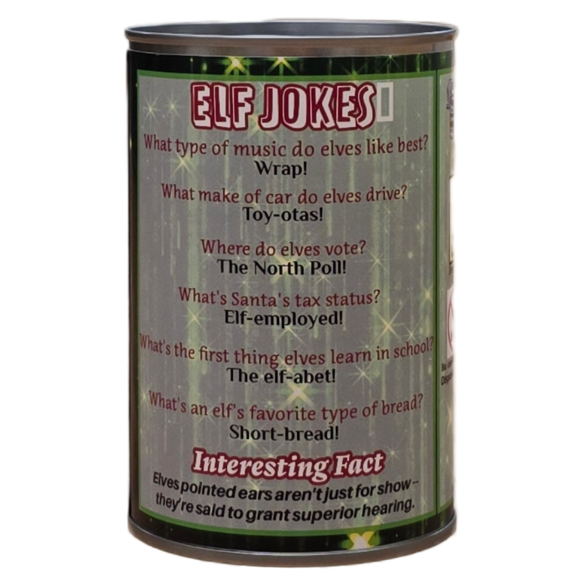 - Funny elf jokes on the can.