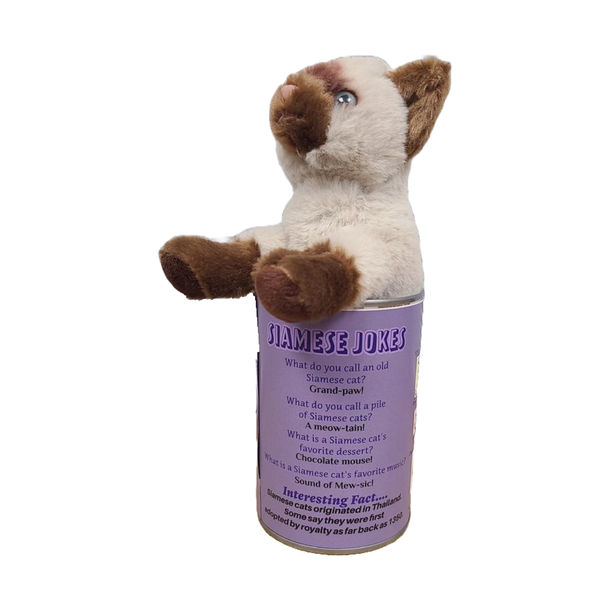 Funny Siamese cat jokes and an interesting fact on the can.