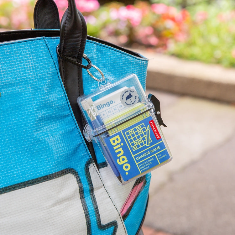 Take this classic game of chance on the go! Includes 59 caller cards, 50 bingo sheets, 4 everlasting pencils, and instructions — all packed in a weatherproof case with keyring carabiner to clip to any bag or strap. Great for travel, camping, and outdoor play.