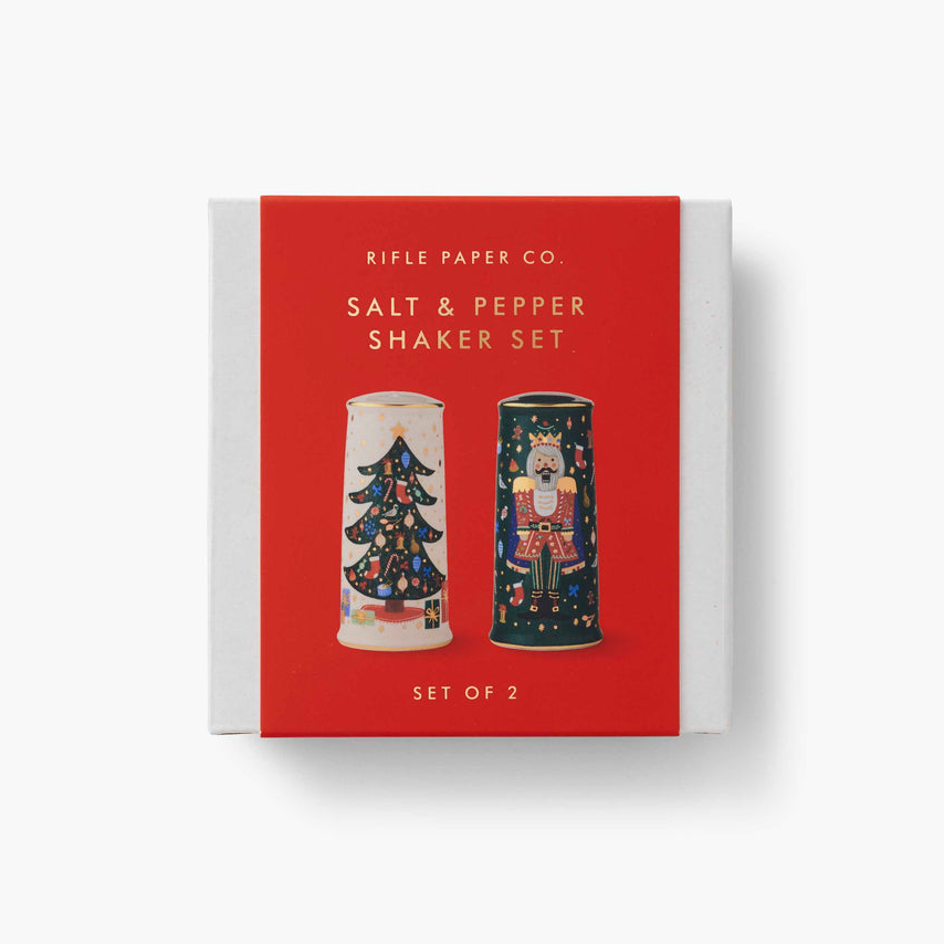 A set of porcelain salt and pepper shakers to add seasoning to your holiday table, featuring gold foil accents and illustrated characters from the classic ballet.
