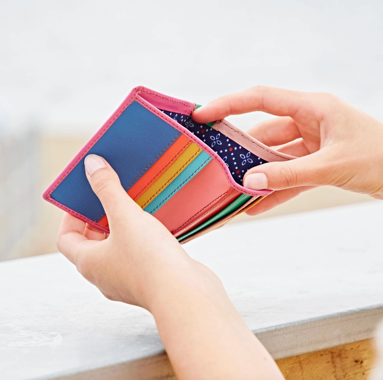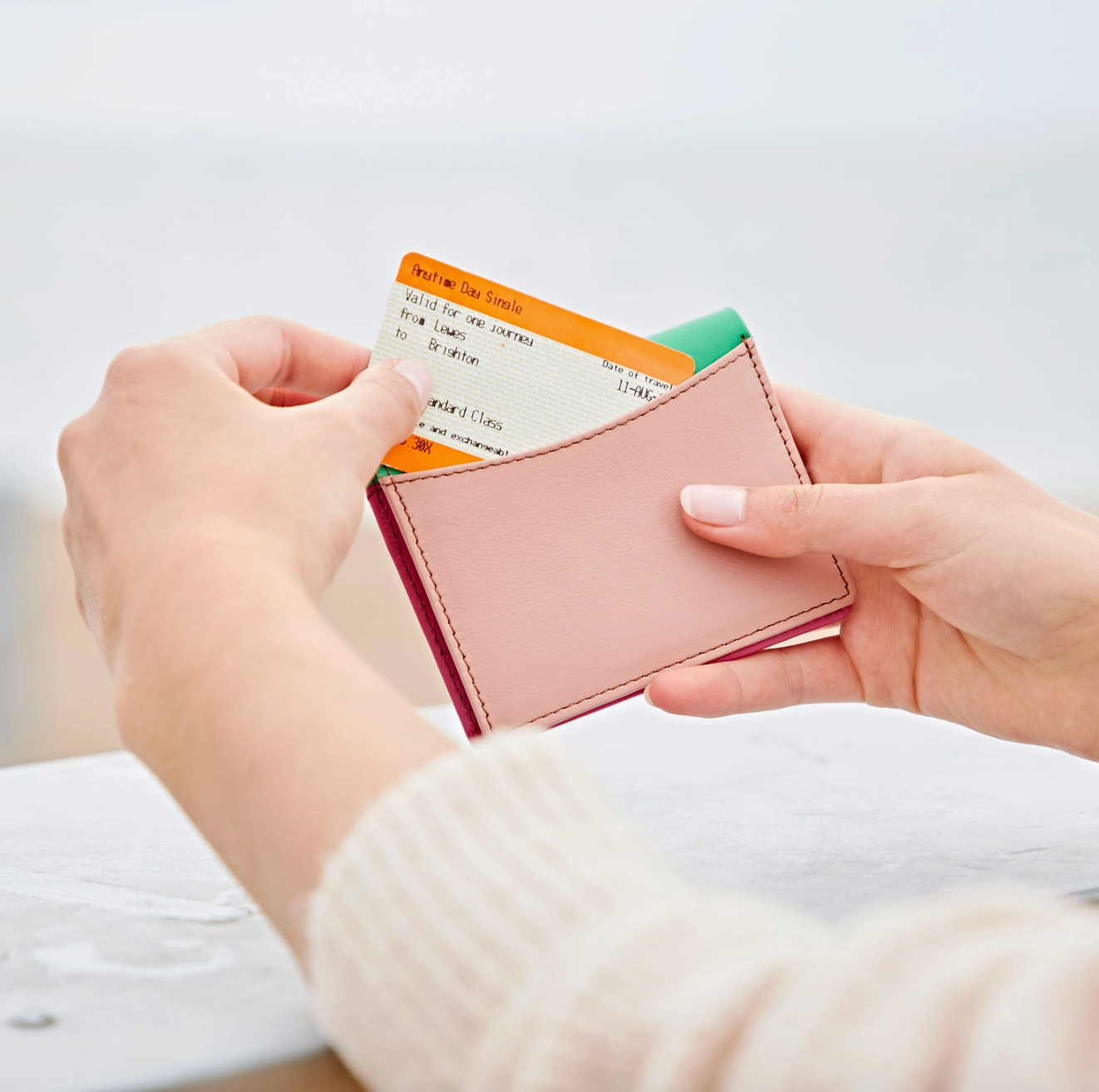 Slip your essentials into this pocket-sized card holder and travel light! Crafted from recycled leather in a surprise color combo, it features 8 card slots, a fabric-lined interior for cash, and an external pocket to keep your most important cards organized and protected. Each handmade piece is wonderfully unique—minor imperfections like scratches add character to your sustainable accessory. Perfect for minimalists who refuse to compromise on style or conscience.