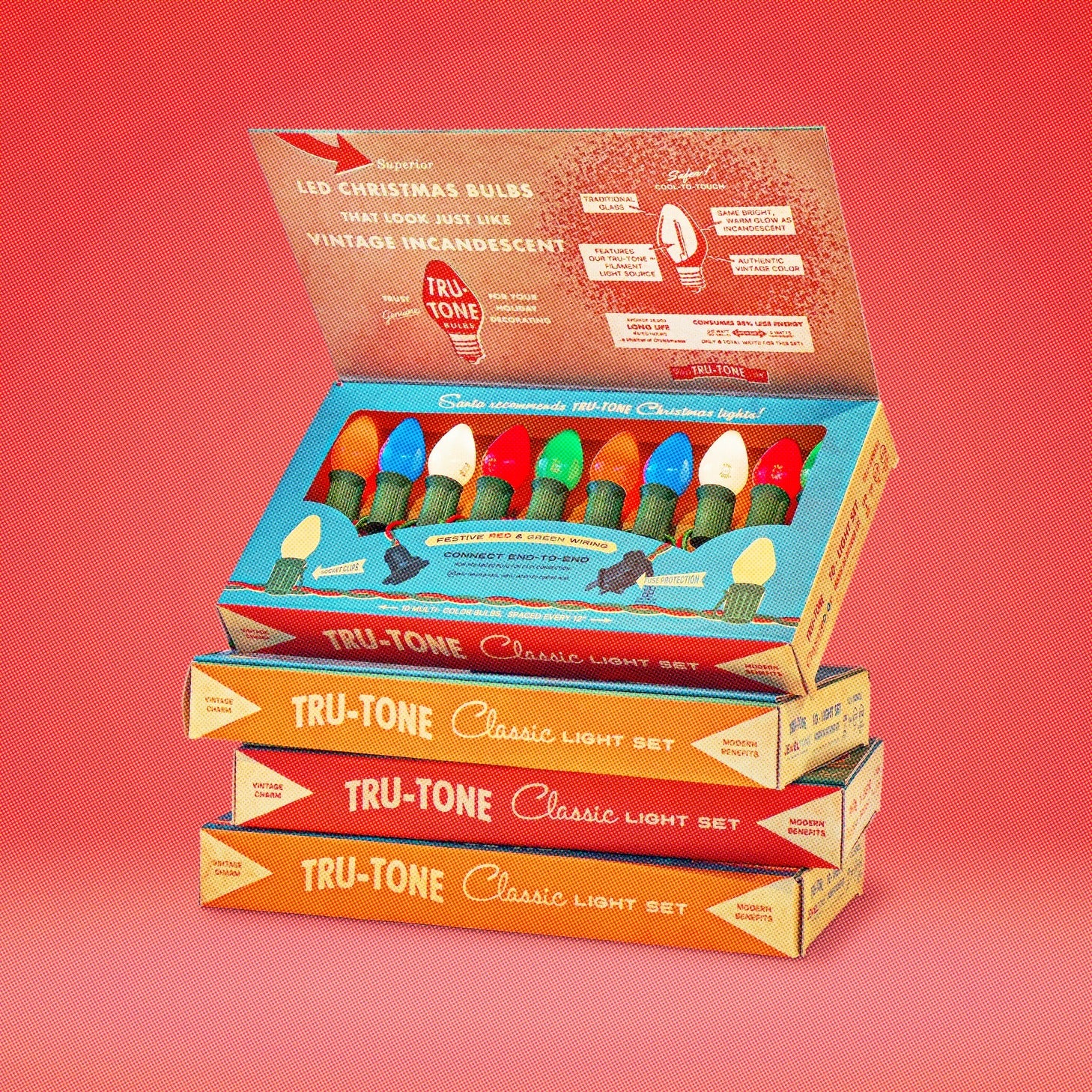 Vintage style 10-bulb Christmas light set in classic display gift box featuring Tru-Tone™ bulbs. The unique ultra-warm LED filament perfectly replicates the warm glow of incandescent. Includes ultra soft and flexible Classic Light String with twisted pair vinyl wire in Red and Green.
